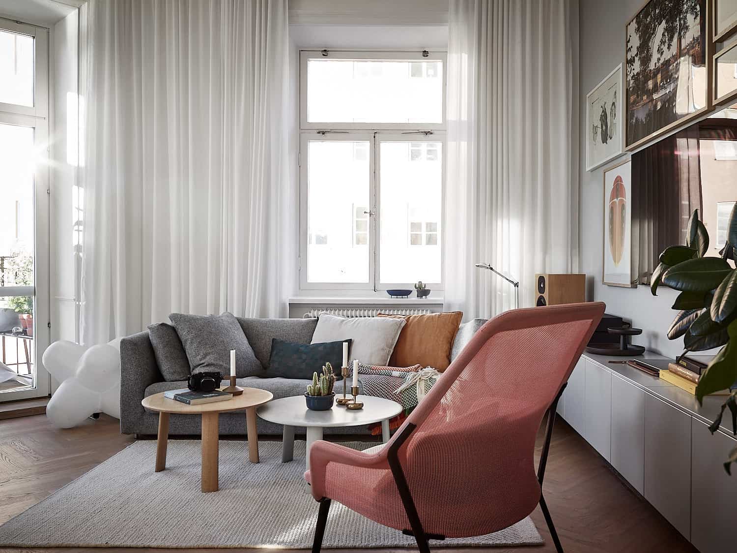 Nếu bạn may mắn có được thật nhiều ánh sáng tự nhiên trong nhà thì còn đợi gì mà không tận dụng điều này. Ánh sáng tự nhiên được yêu thích vì có thể khiến mọi căn phòng trở nên ấm áp và thoáng đãng hơn. Phòng khách này khiến hai khung cửa sổ có chiều cao từ sàn đến trần trở thành điểm nhấn cho cả căn phòng. Dù nhà bạn có đón được thật nhiều ánh sáng tự nhiên hay ở vị trí hạn chế ánh sáng tự nhiên thì đừng bao giờ quên ngó ngàng đến các khung cửa sổ. Chọn ra những thiết kế rèm cửa đẹp với kiểu dáng và màu sắc thật phù hợp cho cửa sổ nhà bạn, cả căn phòng tự nhiên sẽ biến đổi theo cách mà bạn ưng ý nhất.